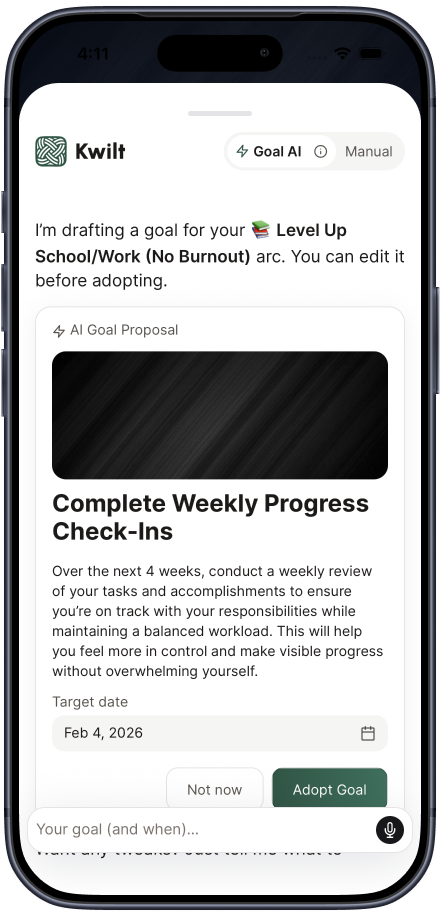 Picture who you want to become. Kwilt helps you clarify a future vision then uses AI to turn it into finishable goals and daily actions.