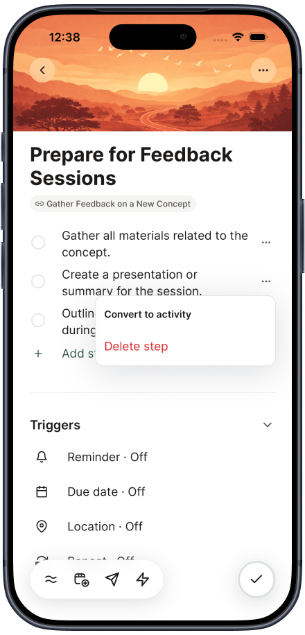 When a step needs real attention, turn it into a standalone daily activity. It stays linked—so progress rolls up without rewriting your plan.